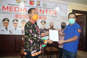Penyerahan bantuan dilakukan di Sekretariat Gustu Lantai 6 Kantor Gubernur Maluku, Kamis (14/5/2020), diterima Sekretaris Gustu Covid-19 Maluku Henry Far-Far.