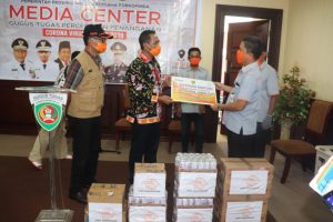 Bantuan yang diserahkan PT. Pos antara lain susu, vitamin dan juga 100 masker untuk para medis.