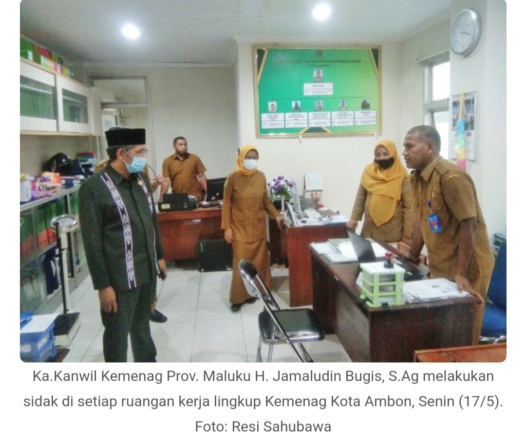 AMBON, MG.com – Ka.Kanwil Kemenag Prov. Maluku H. Jamaludin Bugis, S.Ag melakukan Inspeksi Mendadak (sidak) di setiap ruangan kerja lingkup Kemenag Kota Ambon, Senin (17/5).
