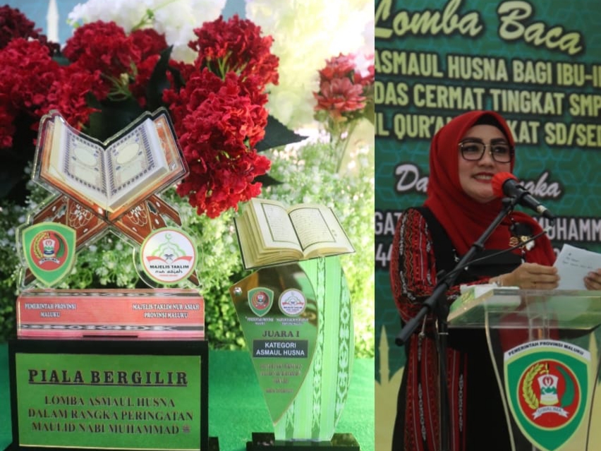 AMBON, MG.com – Ketua Majelis Taklim (MT) Nur Asiah, Widya Pratiwi Murad Ismail, Kamis malam (21/10/2021), bertempat di Gedung Islamic Center, menutup dengan resmi pagelaran lomba baca Syarafal An’am dan Asmaul Husna bagi ibu-ibu majelis taklim dan lomba cerdas cermat tingkat SMP/sederajat, serta Hifzil Qur’an tingkat SD/sederajat dalam rangka memperingati Maulid Nabi Muhammad SAW 1443 Hijriah tahun 2021.