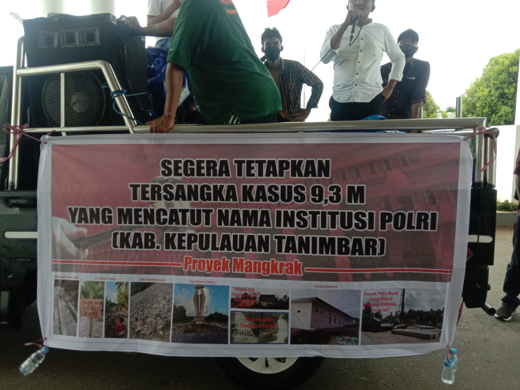 Mereka terlihat membawa spanduk yang menggambarkan beberapa proyek mangkrak, dan bertuliskan “Segera tetapkan tersangka kasus 9,3 Miliar yang mencatut nama institut Polri Kabupaten Kepulauan Tanimbar”.
