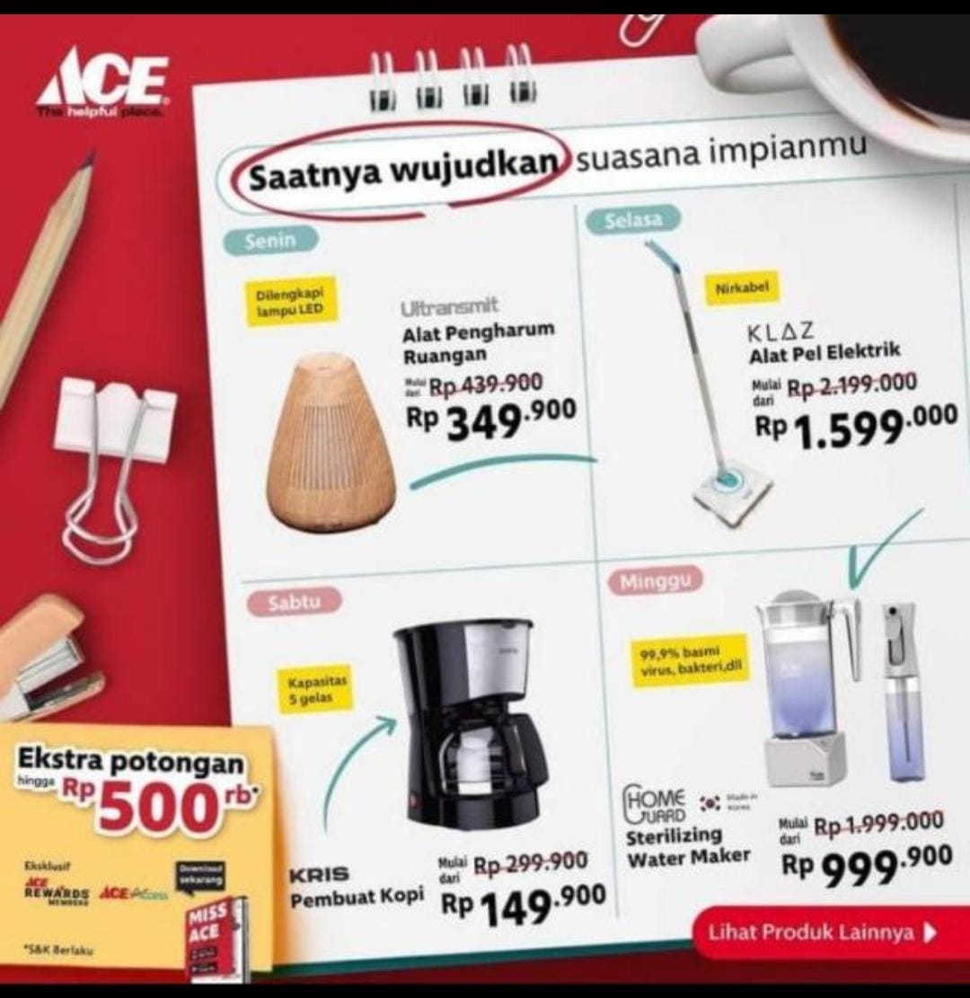 Ambon,MG.com-Kesempatan menarik bagi anda yang ingin memenuhi kebutuhan hunian dan lifestyle. Di bulan mey ini, saatnya wujudkan suasana impianmu bersama Ace hardware.
