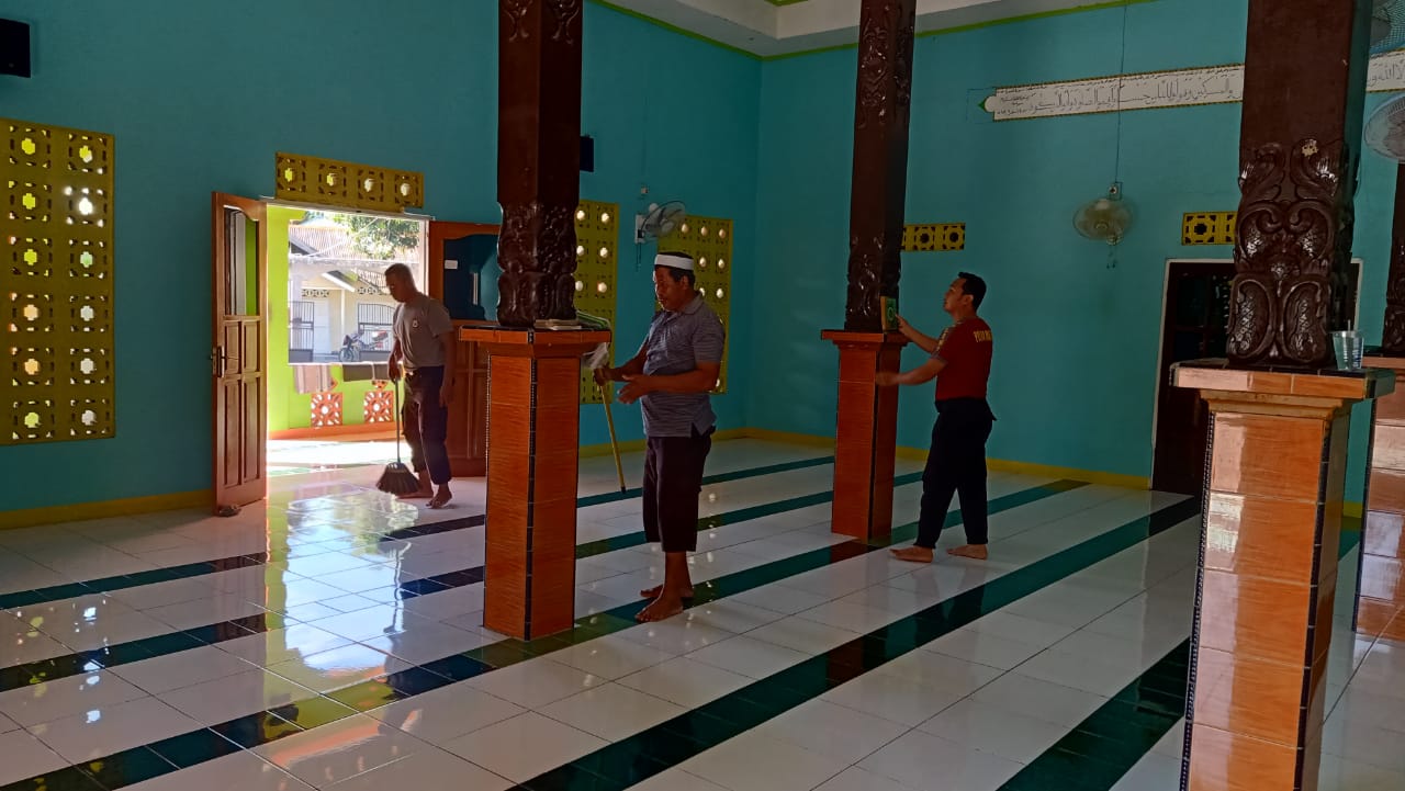 Anggota Polsek Waisarissa berbaur bersama warga lakukan pembersihan area masjid di dalam maupun di halaman masjid.
