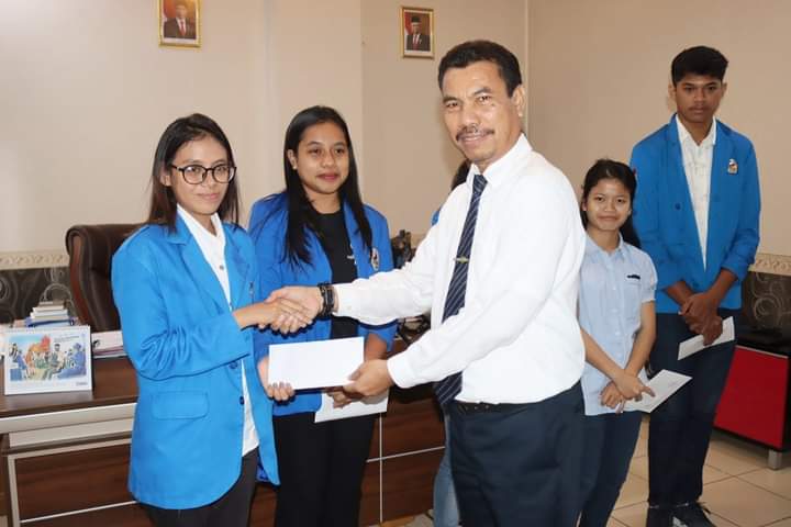 Hadiah diserahkan langsung oleh Wakil Rektor Bidang Kemahasiswaan dan Alumni, Dr. Jusuf Madubun, M.Si, dan didampingi oleh Koordinator Kemahasiswaan dan Humas, French.O. Pattiruhu, S.Sos
