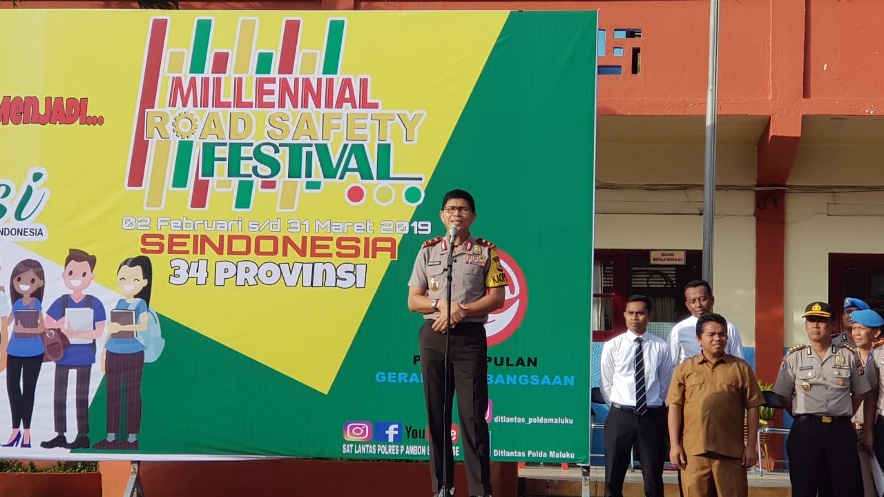 AMBON, MG.com – Polda Maluku menggelar Sosialisasi Millenial Road Safety Festival (MRSF) di SMA Xaverius Ambon – Maluku Senin (14/01/2018).