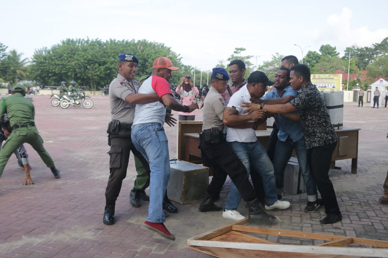 Simulasi dilakukan guna mencegah dan mengantisipasi segala potensi kerawanan yang dapat mengganggu kelancaran pesta demokrasi pada 17 April mendatang. Kesiapan personil terdiri dari 1 (satu) regu patroli Raimas,1 (satu) regu Dalmas awal, 1 (satu) regu tim negosiator, 1 (satu) pleton Dalmas, 1 (satu) Pleton PHH Brimbob, 1 (satu) regu tim tindak. (an)