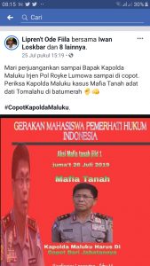 AMBON, MG.com – Pengguna media sosial (facebook) beberapa hari terskhir ini hebih dengan postingan akun fb atas nama Lipren’t Ode Fiila. Pasalnya, dalam postingan tersebut, Lipren’t Ode Fiila menuding Kapolda Maluku, Irjen. Royke Lumowa terlibat mafia tanah.Akun Facebook atas nama Lipren’t Ode Fiila dalam beberapa postingan statusnya menuding orang nomor satu di jajaran Polda Maluku terlibat mafia tanah pasca Pengadilan Negeri (PN) Klas IA Ambon mengeksekusi lahan seluas 5.727 meter persegi di kawasan Kebun Cengkih, Negeri Batu Merah, Kecamatan Sirimau Kota Ambon pada Kamis, 18 Juli lalu.