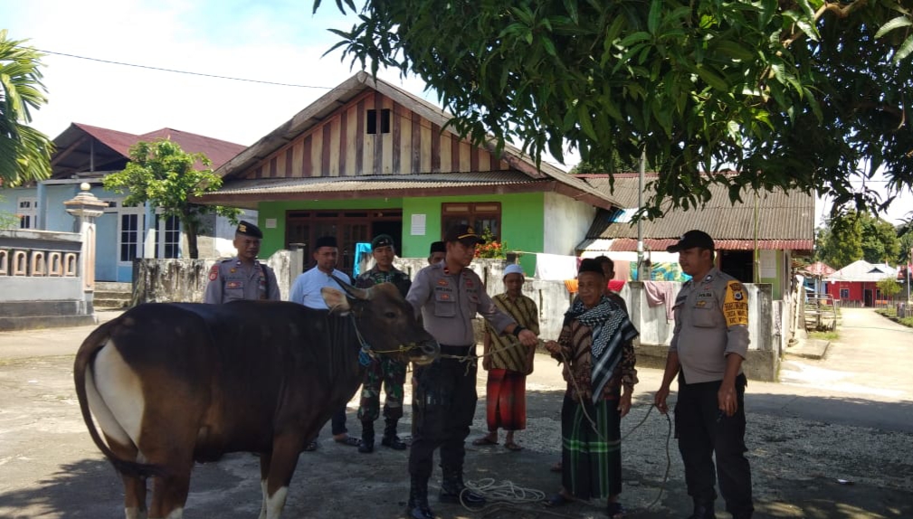 NAMLEA, MG.com – Polres Buru yang diwakili Kapolsek Waesama bersama Kanit Bhimas dan anggota Bhabin Polsek Waesama atas nama Polres Pulau Buru, menyerahkan hewan qurban berupa satu ekor sapi di kepada Masjid An’ Nur Desa Waelekut yang diterima Imam Madjid, Muhamad Wael, Sabtu (10/08/2019).