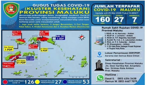 AMBON, MG.com – Kasus terkonfirmasi Covid-19 di Maluku hingga kini menembus angka 160 kasus. Demikian rilis yang dikeluarkan Gugus Tugas Percepatan Penanganan Covid-19 Provinsi Maluku, Jumat (25/5/2020).