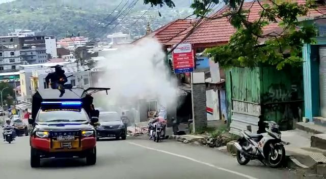 “Hari ini tim KBR Detasemen Gegana Satbrimob Polda Maluku kembali menyemprotkan sejumlah pertokoan di pusat Kota Ambon serta sejumlah jalan protokol Kota Ambon. Kegiatan ini dilakukan setiap hari bahkan hari libur saat ini kami tetap melayani masyarakat dengan baik agar masyarakat bisa beraktifitas dengan aman tanpa ada rasa was-was,” kata Dansat Brimob.