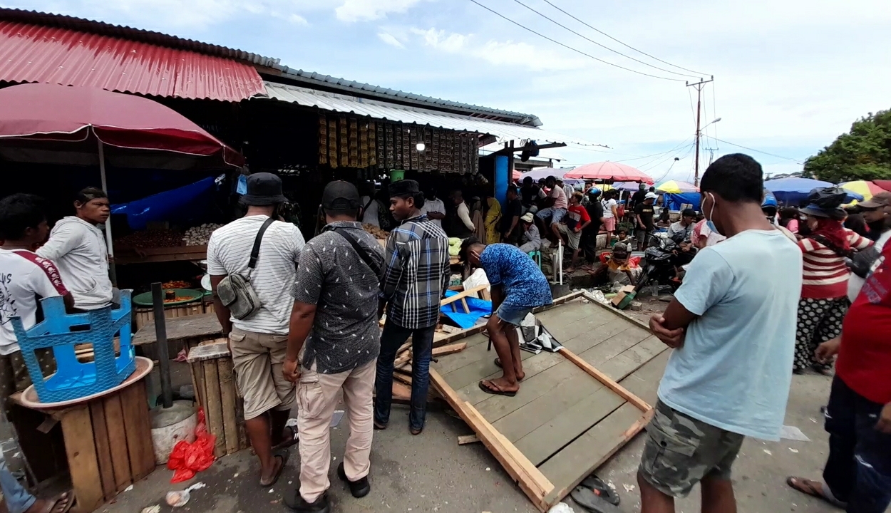 AMBON, MG.com – Pedagang Pasar Mardika Kota Ambon protes terhadap pembongkaran lapak yang dilakukan Satuan Polisi Pamong Praja Kota Ambon, Rabu (03/02/2020).