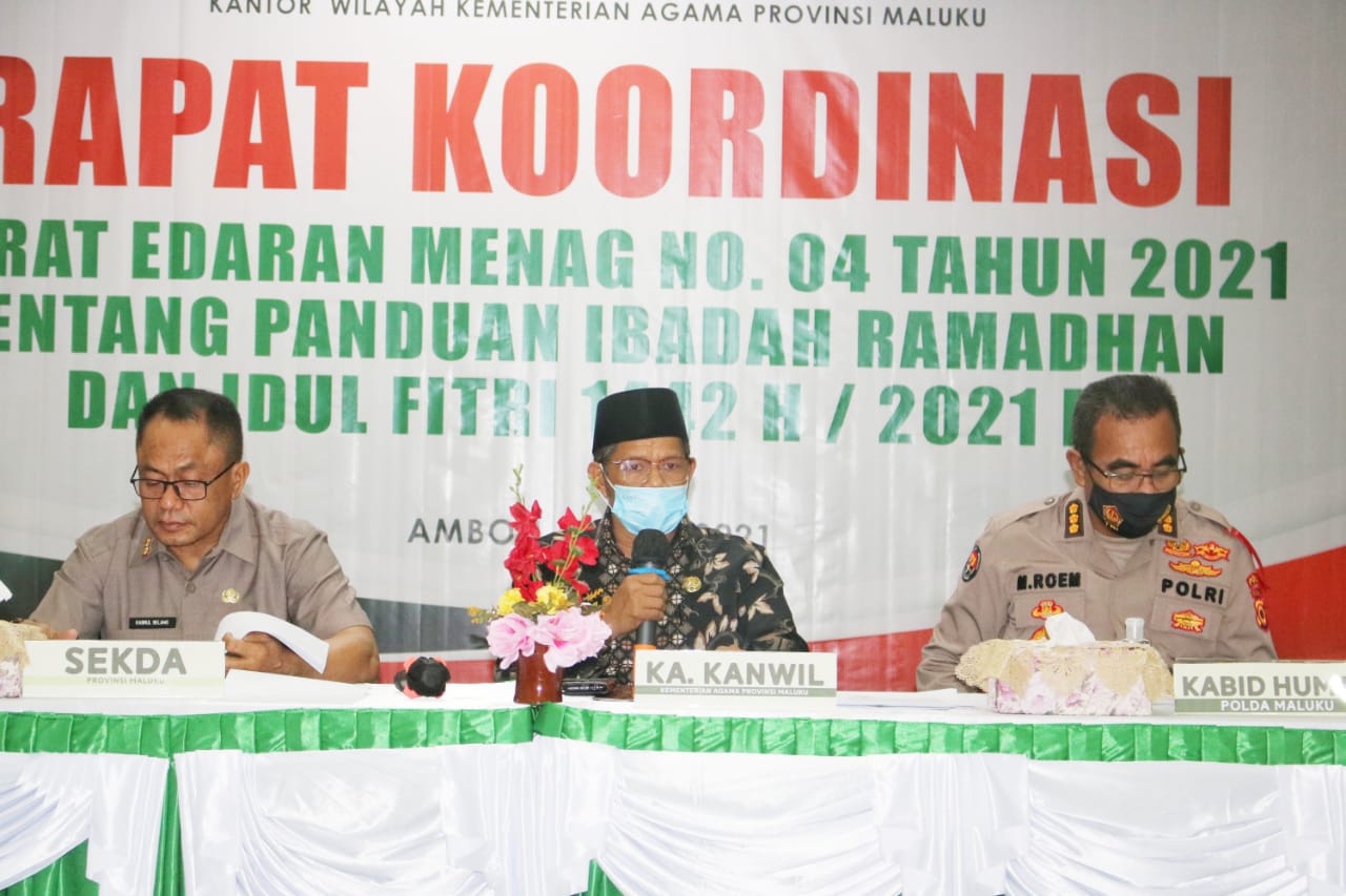 Di tempat yang sama, Ka.Kanwil Kemenag Provinsi Maluku Jamaludin Bugis, dalam arahannya menginstruksikan kepada seluruh ASN Kemenag Maluku untuk mensosialisasikan Surat Edaran Menag Nomor 04 tentang Panduan Ibadah Ramadhan dan Idul Fitri 1442 H/2021 M, kepada masyarakat.