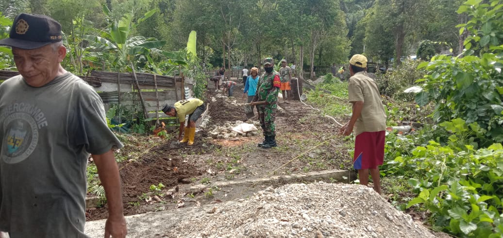 Seperti yang dilakukan Babinsa Banemo Sertu Irwan Amin dan Babinsa Sibenpopo Serda S.S Halirat anggota Kodim 1502/Weda, bersama ratusan masyarakat bergotong royong melaksanakan pembuatan jalan rabat beton di Desa Banemo, Kecamatan Patani Barat, Kabupaten Halmahera Tengah, Rabu, (02/06).