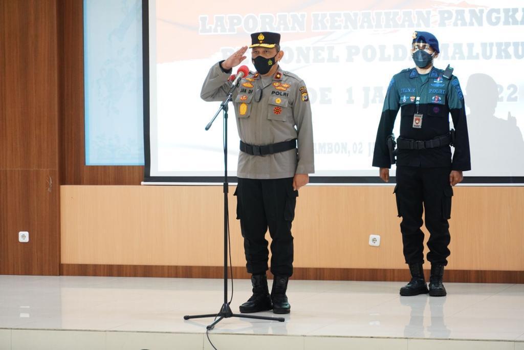 Ratusan personil Polri ini resmi naik pangkat melalui upacara Laporan Kenaikan Pangkat yang dipimpin Wakapolda Maluku Brigjen Pol Drs Jan de Fretes, M.M. di Ruang Rapat Utama Markas Polda Maluku, Kota Ambon, Sabtu (01/01/2021).
