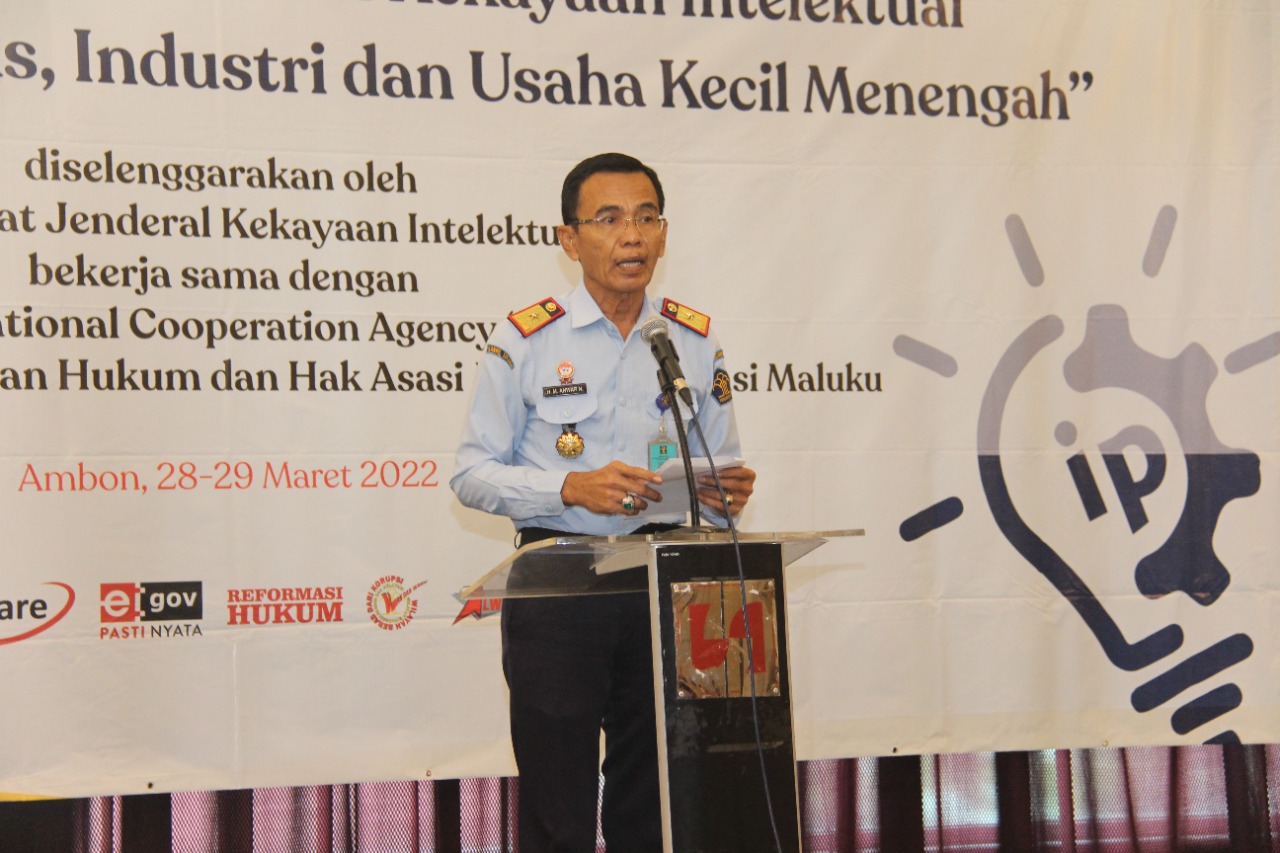 Ambon, KUMHAM MALUKU,MG.com– Kantor Wilayah (Kanwil) Kementerian Hukum dan Hak Asasi Manusia (Kemenkumham) Maluku dalam kerjasamanya dengan Direktorat Jenderal Kekayaan Intelektual (DJKI) dan Japan International Cooperation Agency (JICA) menyelenggarakan Seminar “Perlindungan dan Pemanfaatan Kekayaan Intelektual bagi Kalangan Universitas, Industri dan Usaha Kecil Menengah” Tahun 2022, Senin (28/03).