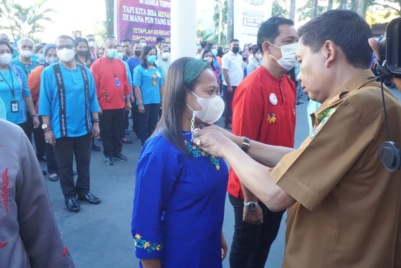 Ambon,MG.com-Pemasangan PIN Wajar Tanpa Pengecualian (WTP) kepada seluruh aparatur sipil negara ( ASN) lingkup Pemkot Ambon sudah direalisasikan yang dipasangkan langsung oleh penjabat walikota ambon Bodewin Wattimena yang berlangsung dihalaman parkir pemkot ambon Selasa (07/06/22).