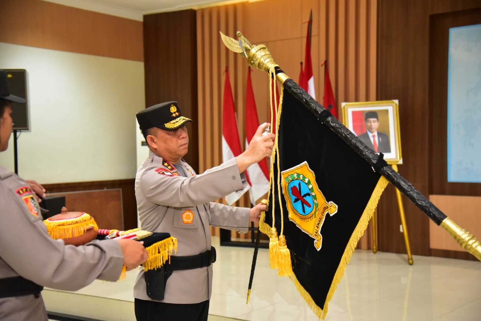 Upacara penyucian Pataka Salawaku Emarina dipimpin langsung oleh Kapolda Maluku Irjen Pol Drs. Lotharia Latif, SH.,M.Hum. Turut hadir Wakapolda, Brigjen Pol Drs. Jan Leonard de Fretes M.M, Irwasda, Kombes Pol Jannus Parlindungan Siregar Sik, para pejabat utama Polda Maluku serta perwakilan personel dari masing-masing satuan kerja.