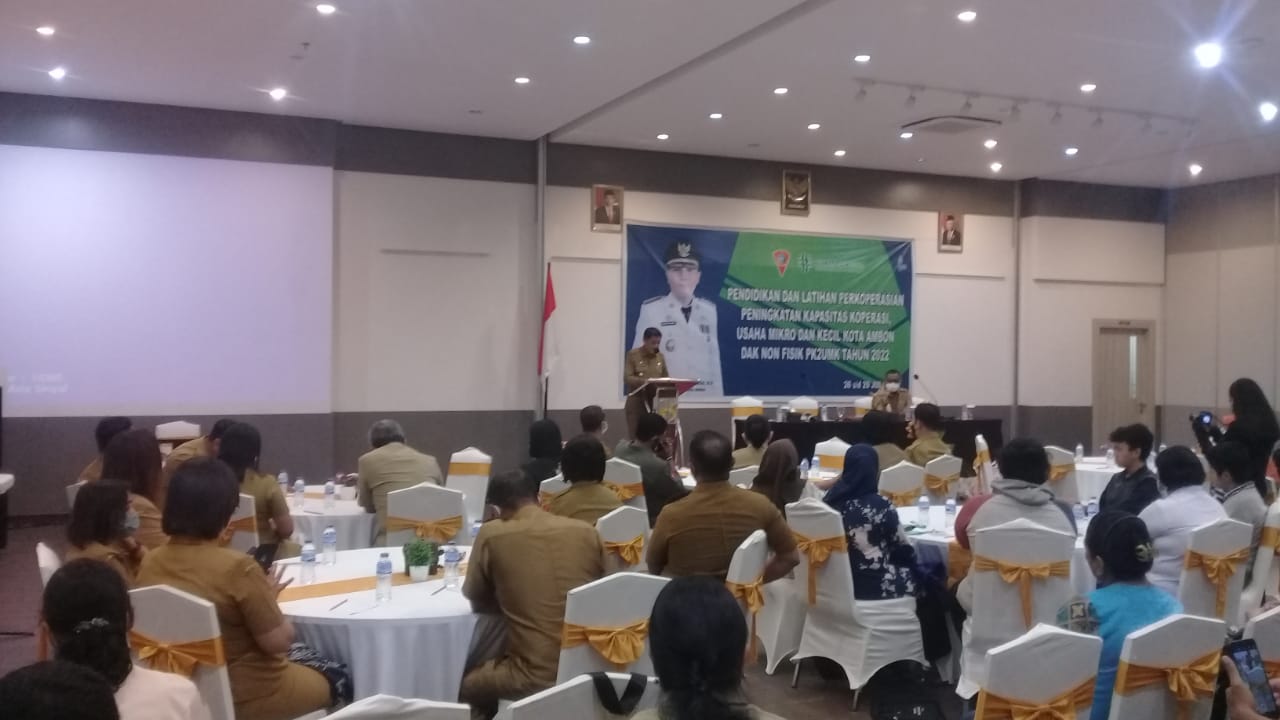 Ambon,MG.com-Pemerintah kota ambon mengelar kegiatan pendidikan dan latihan perkoperasian,peningkatan kapasitas koperasi usaha mikro dan kecil ( PK2UMK) kota ambon Dana alokasi ( DAK ) nonfisik tahun 2022 yang berlangsung hotel manise selasa ( 26/07/22).