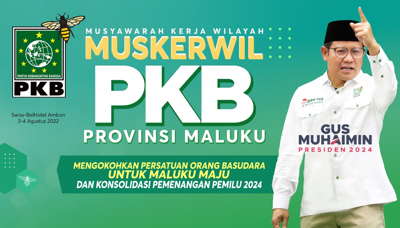 AMBON, MG.com – Musyawarah Kerja Wilayah DPW PKB Maluku akan digelar di Swis Bell Hotel Ambon pada 3-4 Agustus 2022 akan dihadiri Muhaimin Iskandar Ketua Umum DPP PKB yang juga calon Presiden 2024.