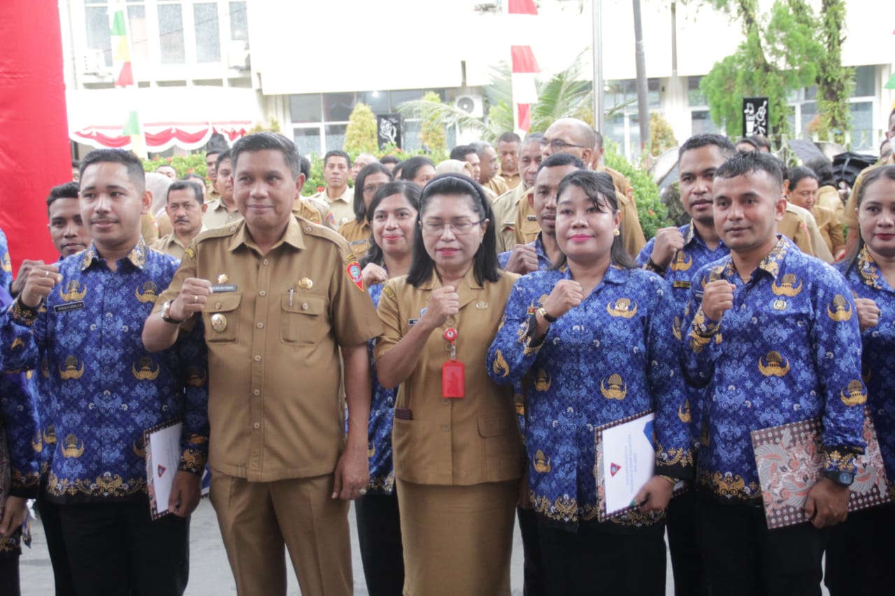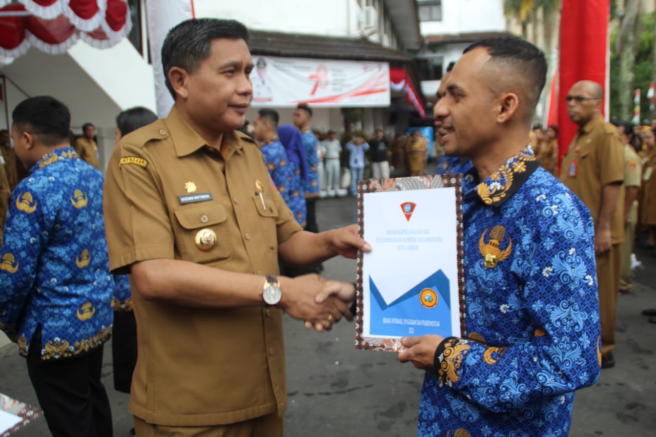 Ambon,MG com – Pejabat Walikota Ambon Bodewin Wattimena menyerahkan surat keputusan Pegawai Pemerintah dengan Perjanjian Kerja ( PPPK ) kepada 302 guru pada halaman parkir Balai Kota Ambon, Senin (28/8/2023).