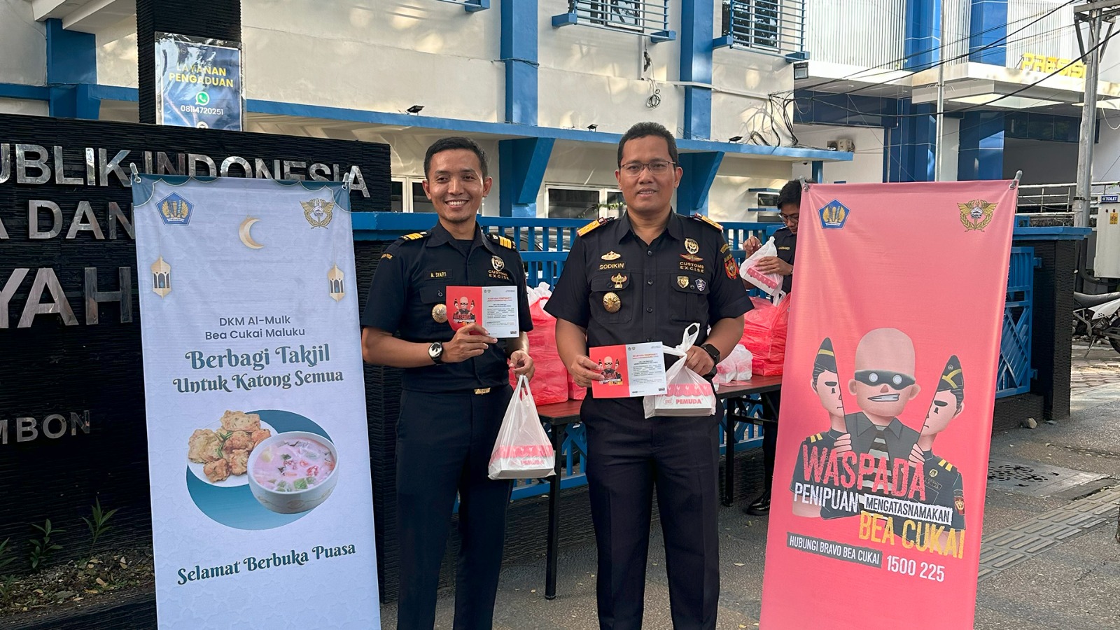 Ambon,MG.com- Kanwil Bea Cukai Maluku bersama DKM Mushola Al Mulk Kanwil DJBC Maluku di bulan Ramadhan ini mengadakan kegiatan Sosialisasi Waspada Penipuan Mengatasnamakan Bea Cukai dengan cara pembagian pamflet dan pembagian takjil gratis kepada masyarkat di kota Ambon.