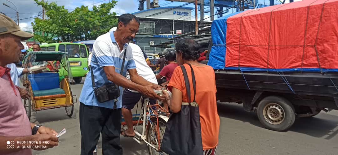 “Berbagi kasih dilakukan Tim Manajemen Ferly Tahapary For Kota Ambon di depan Pelabuhan Slamet Riyadi Ambon kepada para tukang becak, ojek, sapu jalan dan gerobak yang beraktifitas di sepanjang jalan tersebut.