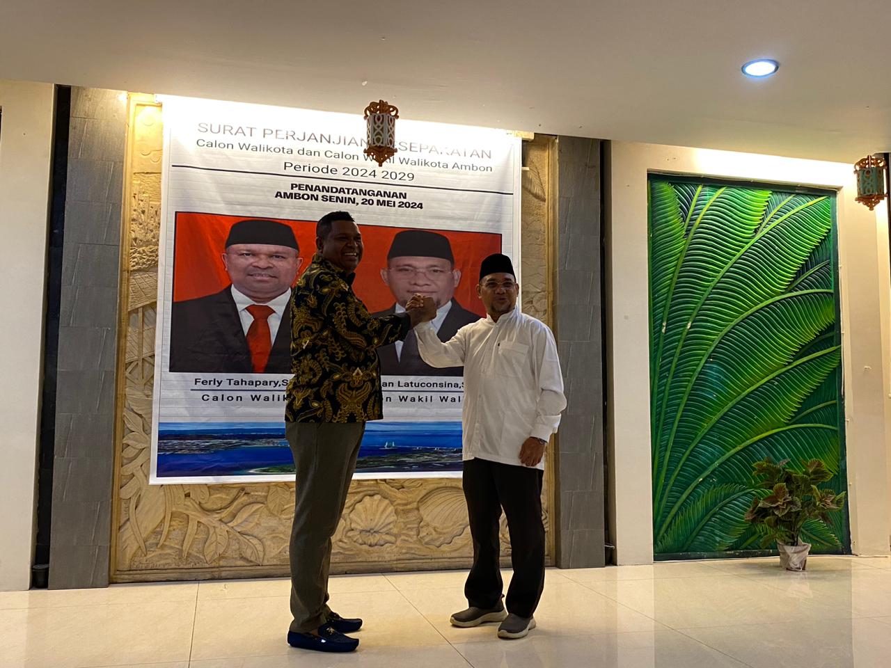 Ambon,MG.com-Ferly Tahapary dan Abdul Mannan Latuconsina atau dikenal FirMan melakukan penandatangan surat perjanjian kesepakatan untuk menyatakan diri sebagai Calon Wali Kota Ambon dan Wakil Wali Kota Ambon.