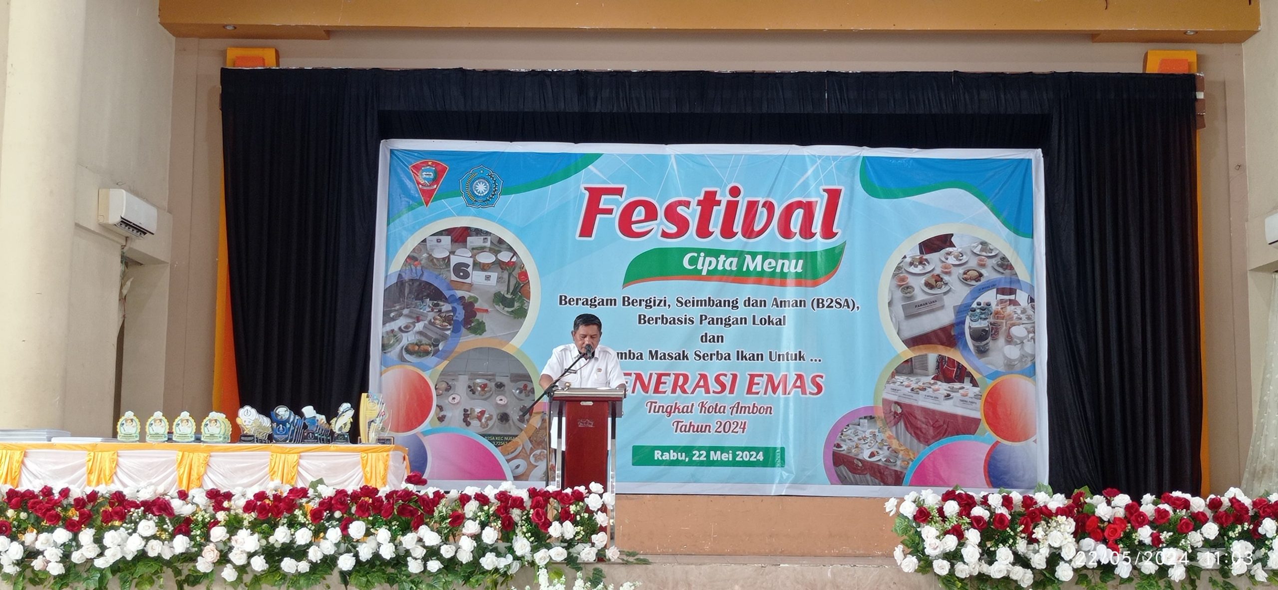 Ambon,MG.com-PJ Walikota Ambon Bodewin Wattimena membuka secara resmi kegiatan festival cipta menu beragam,bergizi,seimbang dan aman ( B2SA ) dan lomba masak serba ikan untuk generasi emas tingkat Kota Ambon tahun 2024 yang berlangsung gedung serbaguna Xaverius,Rabu ( 22/05/24).