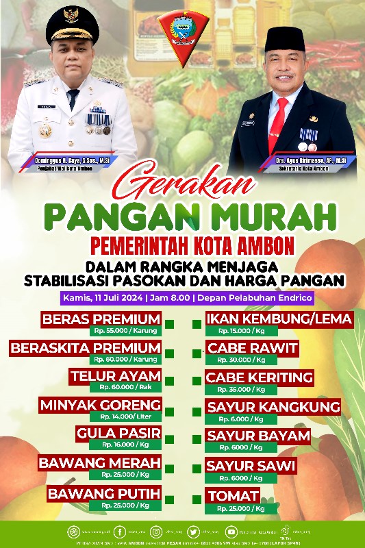 Ambon,MG.com- Besok, tepatnya Kamis 11 Juli 2024 Pemerintah Kota (Pemkot) Ambon akan menggelar Gerakan Pangan Murah (GPM), untuk menjaga stabilisasi Pasokan dan Harga Pangan bagi masyarakat.