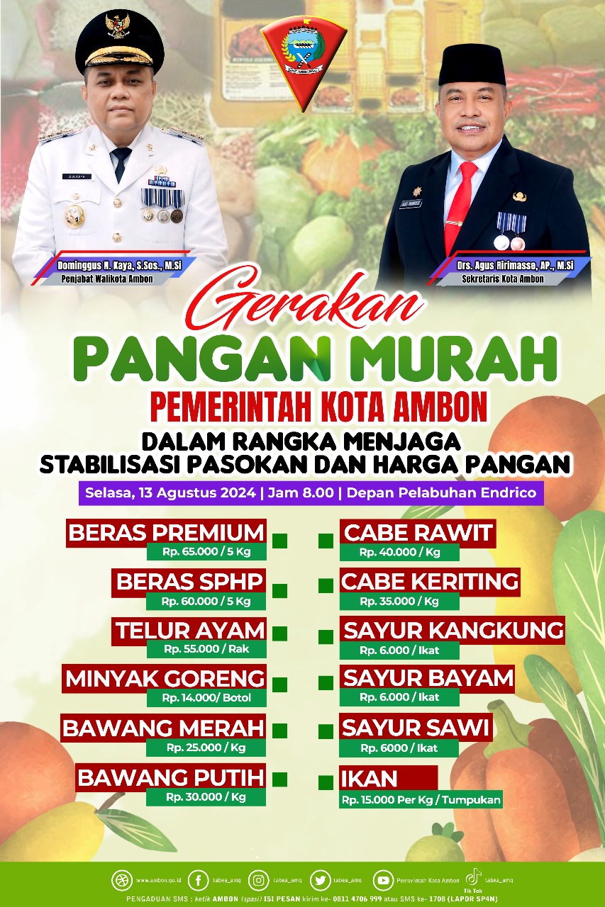 Ambon,MG.com- Pemerintah Kota (Pemkot) Ambon terus berupaya menjaga stabilisasi Pasokan dan Harga Pangan bagi masyarakat melalui Gerakan Pangan Murah (GPM).